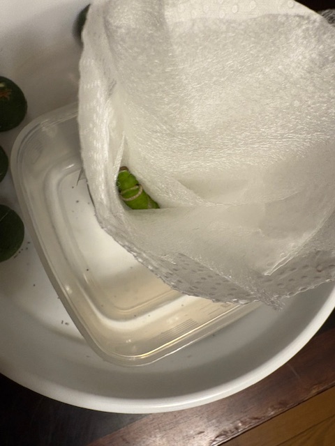 前蛹になる前に落下 2025.08.06 イモ活フォーラム › イモ活フォーラム › 質問 › 前蛹になる前に落下 このトピックには6件の返信、2人の参加者があり、最後にcatmataにより4ヶ月、 4週前に更新されました。 前蛹になる前に落下 質問 7コメント 4ヶ月、 4週前 1 catmata参加者 2025年8月6日(水) 22時07分37秒 違反報告 クロアゲハイモちゃんが、糸掛けして1時間後ぐらいに落下してしまいました。(そんなことってあるんでしょうか・・・・) まだ「くの字」にもなっていなくて、体は縮みかけていますが、まだイモに近い感じです。いったん不織布の上に取り上げて寝かせていましたが、アゲハ館の書き込みをみて、 ペーパータオルで漏斗状のものを作って、初めに寝かしていた不織布ごと中に入れて立てました。 こんな感じで助けられそうでしょうか。これで「くの字」の前蛹になれるのか、もうだめか。。。 Attachments:IMG_2349.jpg 2 たむら船堀キーマスター 2025年8月6日(水) 22時33分46秒 違反報告 うちでもそういうことがありました。 それで大丈夫だと思います。🐛👍 3 catmata参加者 2025年8月6日(水) 23時18分10秒 違反報告 ありがとうございます!運とイモちゃんの力を信じて様子を見ます! 4 catmata参加者 2025年8月7日(木) 22時06分41秒 違反報告 おかげさまで、「くの字」をすっとばして、あの態勢から頑張って蛹になりました! 落ち着いたら、もっとぴったりしたポケットを作ってあげたほうがいいでしょうか? このままそっとして羽化を待っても大丈夫でしょうか。 入っているのが不織布とキッチンペーパーなので足場にはなりそうです。 5 catmata参加者 2025年8月15日(金) 10時39分50秒 違反報告 残念ながら、蛹になったところで力尽きてしまったみたいで、しなびてカピカピになってしまい、死亡確認、先ほどお弔いいたしました。合掌。天国で蝶になってね。。。 でも、落下した時の対応について経験値がつきました、ありがとうございました。 6 たむら船堀キーマスター 2025年8月15日(金) 12時48分41秒 違反報告 いえいえ、とんでもないです。 それは残念でした。次回は羽化まで行くといいですね。🐛🦋 7 catmata参加者 2025年8月19日(火) 10時14分11秒 違反報告 兄弟が羽化しました。本当に綺麗ですね! Attachments:5dd7f65e414b323cc40080365599c24f-1.jpg 6件の返信を表示中 - 1 - 6件目 (全6件中) 最新 コメントをするにはログインまたは無料会員登録をしてください。 関連トピック 前蛹からの脱皮失敗? 2コメント 3ヶ月、 3週前 これ誰? 3コメント 7ヶ月、 2週前 助けてください! 3コメント 6ヶ月前 羽化不全のアゲハの飼育容器について 8コメント 6ヶ月、 1週前 梅雨の羽化について 5コメント 7ヶ月前
