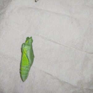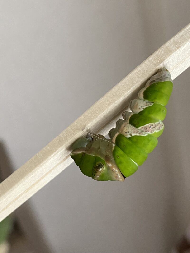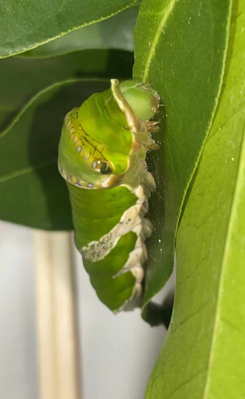 また、頭部〜胸部/口元が茶色ぽくなっているように見えます。これはナガサキアゲハが前蛹になる際に色づくものでしょうか?ナガサキアゲハの飼育が初めてなもので、質問させていただきました。